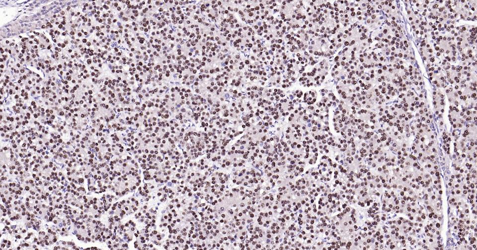Paraformaldehyde-fixed, paraffin embedded Human Liver Cancer; Antigen retrieval by boiling in sodium citrate buffer (pH6.0) for 15 min; Antibody incubation with PCNA(Nuclear Loading Control) Monoclonal Antibody, Unconjugated(bsm-33035M) at 1:200 overnight at 4°C, followed by conjugation to the SP Kit (Mouse, sp-0024) and DAB (C-0010) staining.