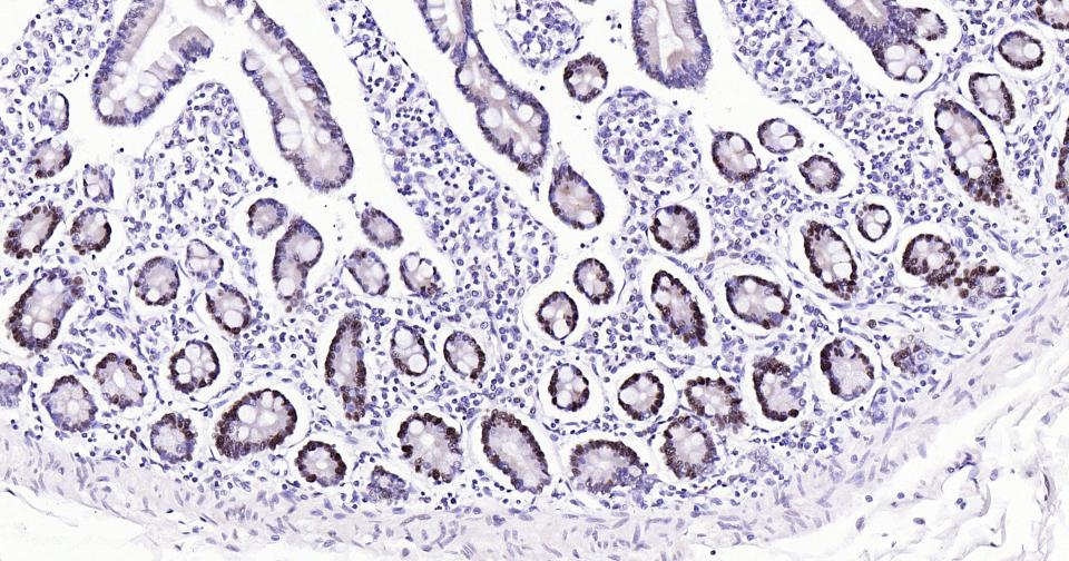 Paraformaldehyde-fixed, paraffin embedded Rat Small Intestine; Antigen retrieval by boiling in sodium citrate buffer (pH6.0) for 15 min; Antibody incubation with PCNA(Nuclear Loading Control) Monoclonal Antibody, Unconjugated(bsm-33035M) at 1:200 overnight at 4°C, followed by conjugation to the SP Kit (Mouse, sp-0024) and DAB (C-0010) staining.