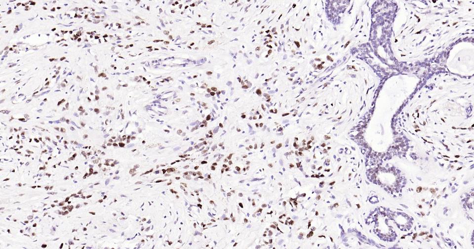 Paraformaldehyde-fixed, paraffin embedded Human Breast Cancer Antigen retrieval by boiling in sodium citrate buffer (pH6.0) for 15 min; Antibody incubation with PCNA(Nuclear Loading Control) Monoclonal Antibody, Unconjugated(bsm-33035M) at 1:200 overnight at 4°C, followed by conjugation to the SP Kit (Mouse, sp-0024) and DAB (C-0010) staining.
