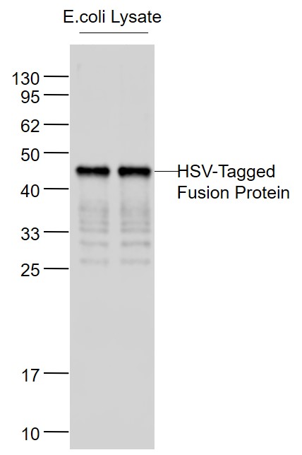 Sample: Lane1: HSV-Tagged Fusion Protein Overexpression E.coli Lysate at 2ug Lane2: HSV-Tagged Fusion Protein Overexpression E.coli Lysate at 2ug Primary: Anti-HSV tag (bsm-33119M) at 1/1000 dilution Secondary: IRDye800CW Goat Anti-Mouse IgG at 1/20000 dilution Predicted band size: 41 kD Observed band size: 45 kD
