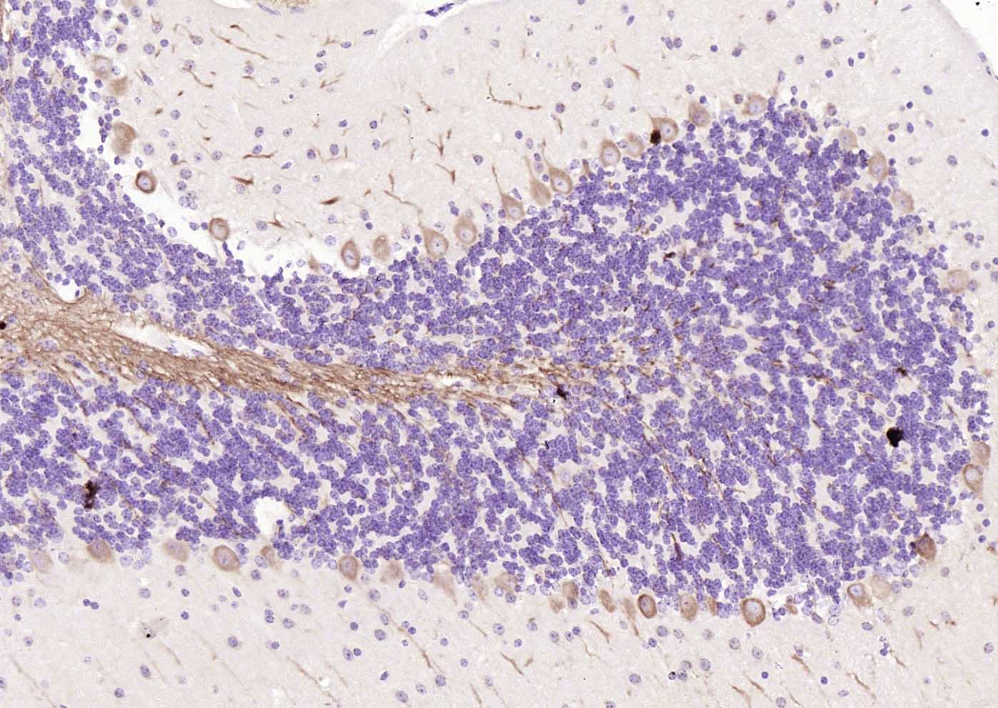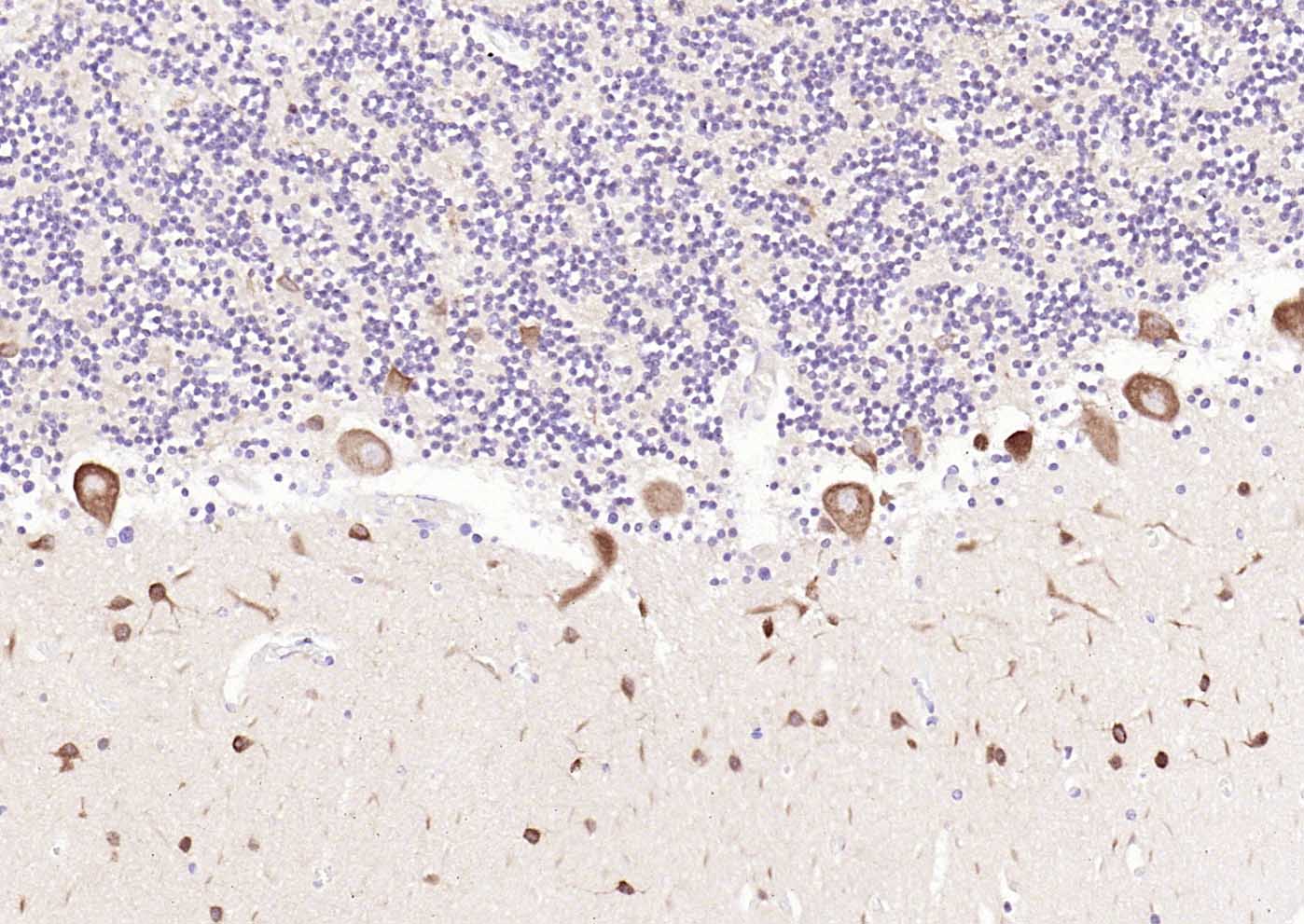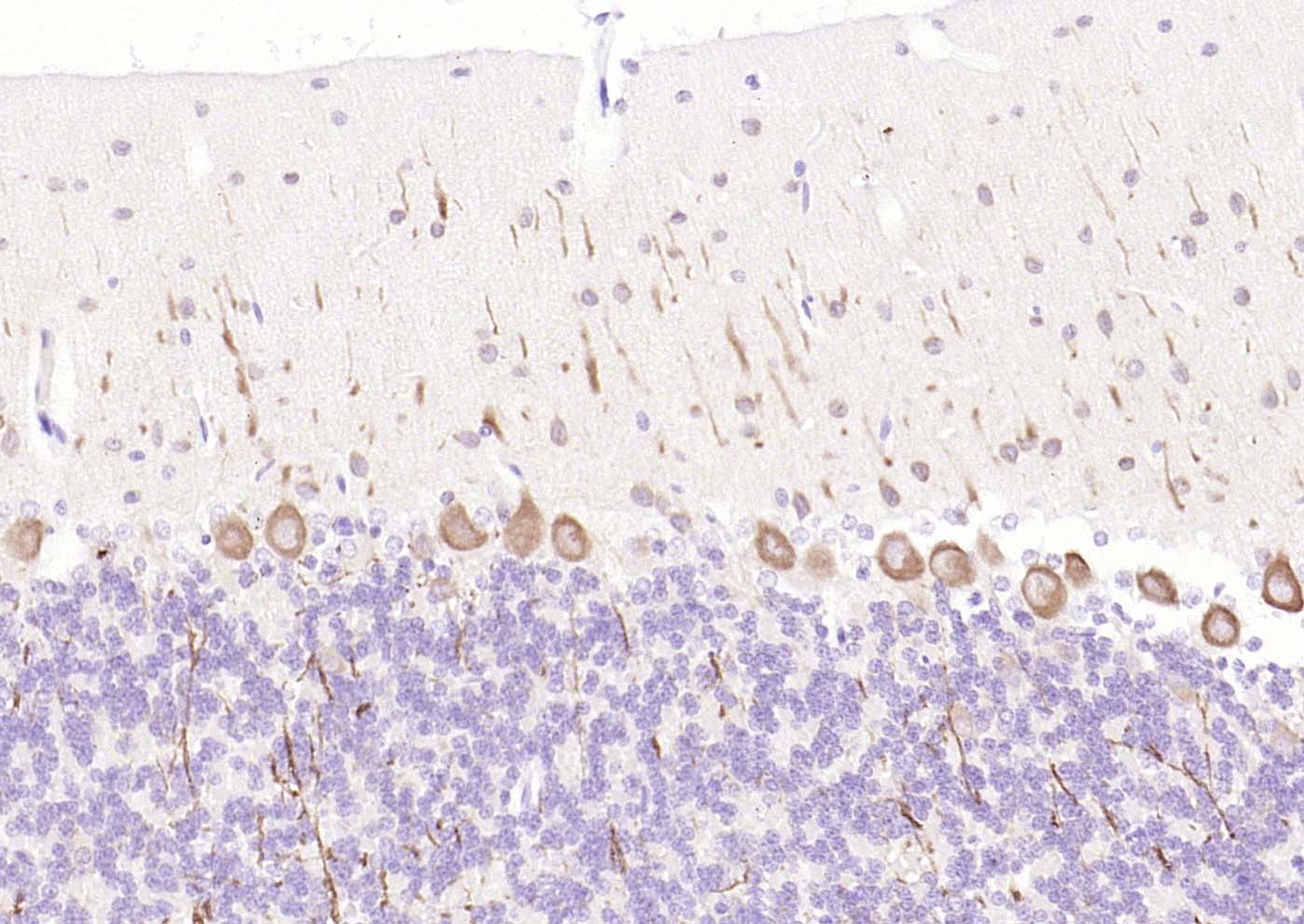 Paraformaldehyde-fixed, paraffin embedded (rat cerebellum); Antigen retrieval by boiling in sodium citrate buffer (pH6.0) for 15min; Block endogenous peroxidase by 3% hydrogen peroxide for 20 minutes; Blocking buffer (normal goat serum) at 37°C for 30min; Incubation with (LC3A ) Monoclonal Antibody, Unconjugated (bsm-33309M) at 1:200 overnight at 4°C, followed by operating according to SP Kit(Mouse)(sp-0024) instructionsand DAB staining.