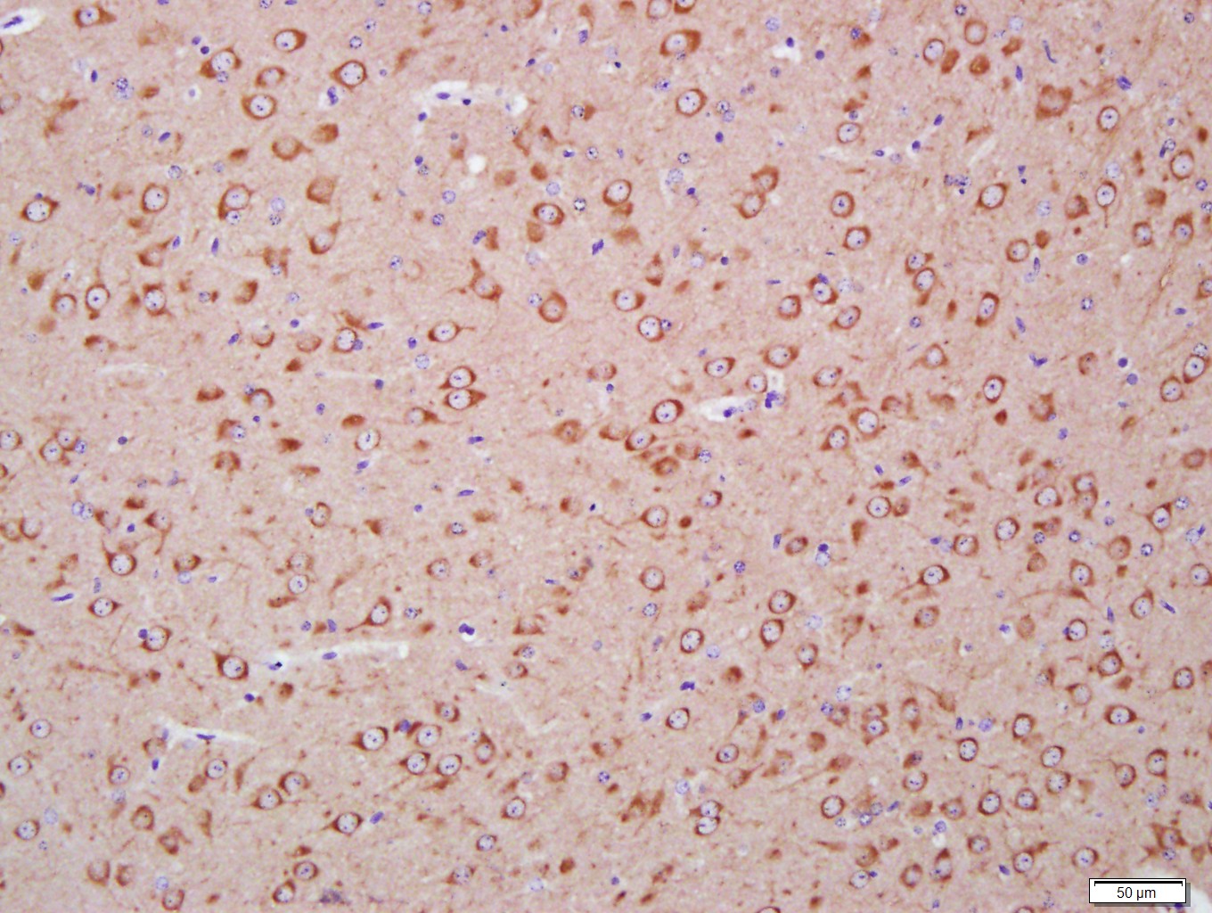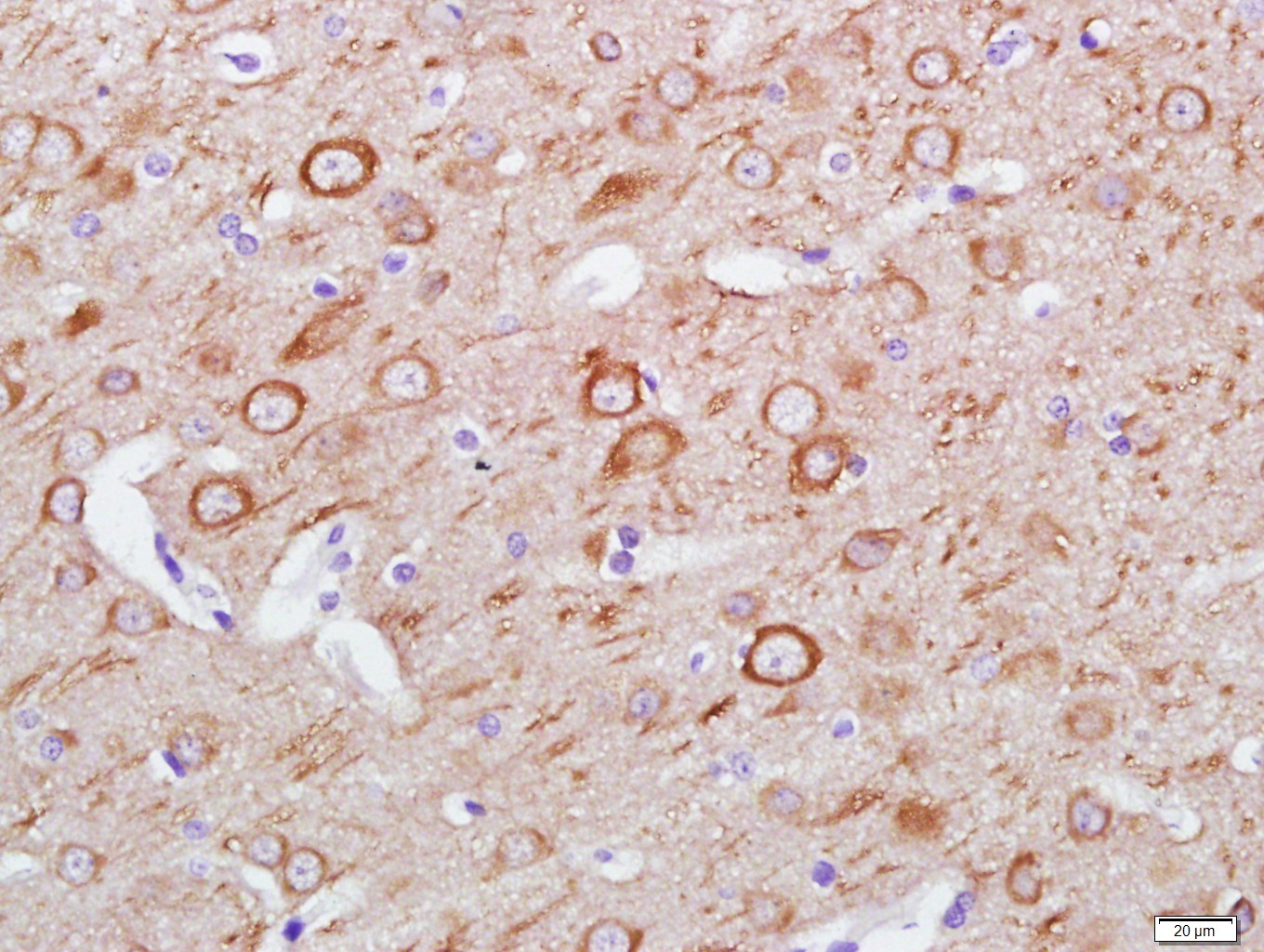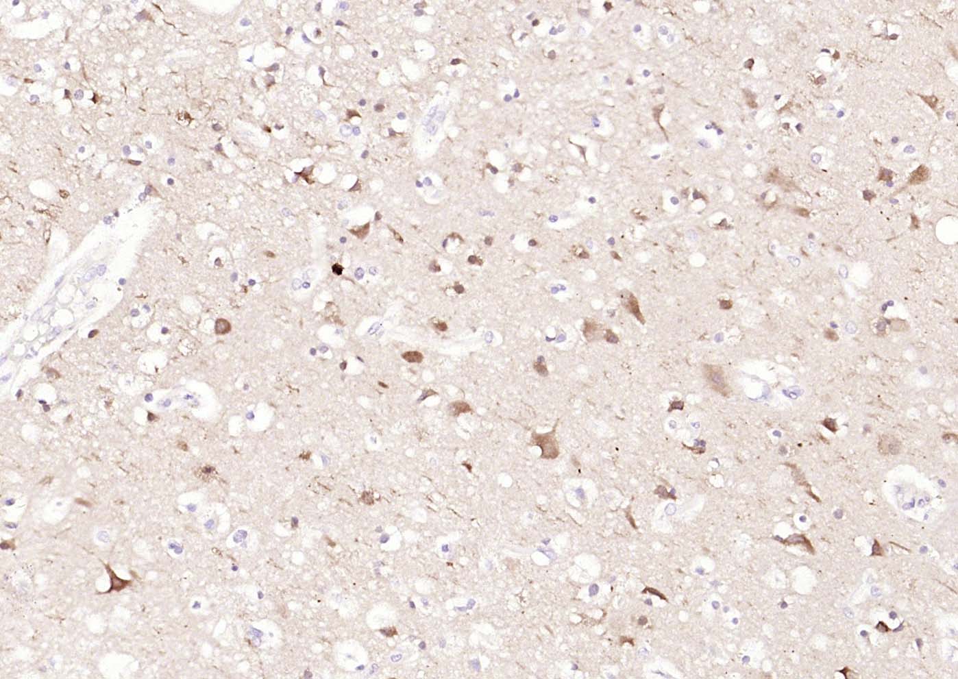 Paraformaldehyde-fixed, paraffin embedded (human brain); Antigen retrieval by boiling in sodium citrate buffer (pH6.0) for 15min; Block endogenous peroxidase by 3% hydrogen peroxide for 20 minutes; Blocking buffer (normal goat serum) at 37°C for 30min; Incubation with (LC3A ) Monoclonal Antibody, Unconjugated (bsm-33309M) at 1:200 overnight at 4°C, followed by operating according to SP Kit(Mouse)(sp-0024) instructionsand DAB staining.