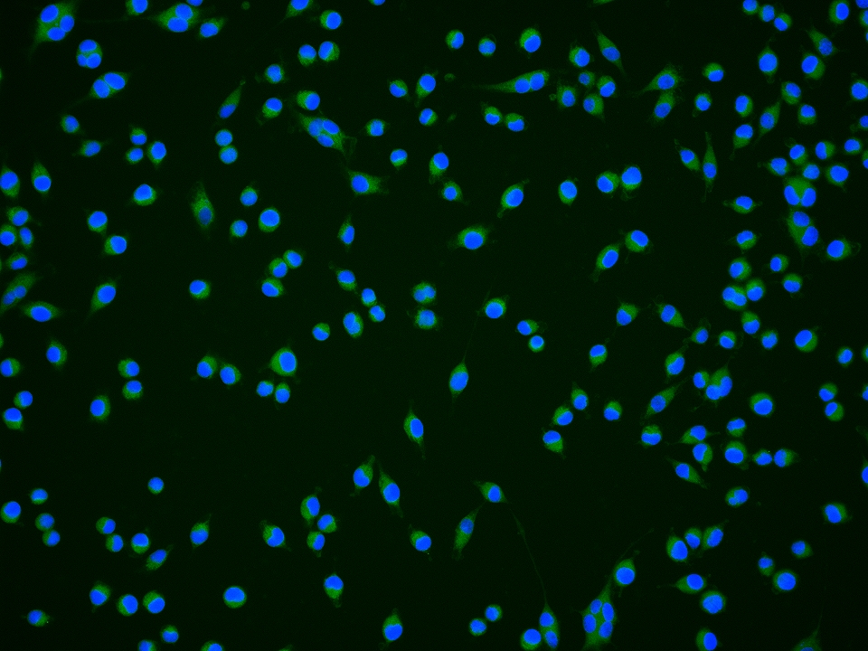 SH-SY5Y cell; 4% Paraformaldehyde-fixed; Triton X-100 at room temperature for 20 min; Blocking buffer (normal goat serum, C-0005) at 37°C for 20 min; Antibody incubation with (LC3A) polyclonal Antibody, Unconjugated (bsm-33309M) 1:25, 90 minutes at 37°C; followed by a conjugated Goat Anti-Mouse IgG antibody at 37°C for 90 minutes, DAPI (blue, C02-04002) was used to stain the cell nuclei.