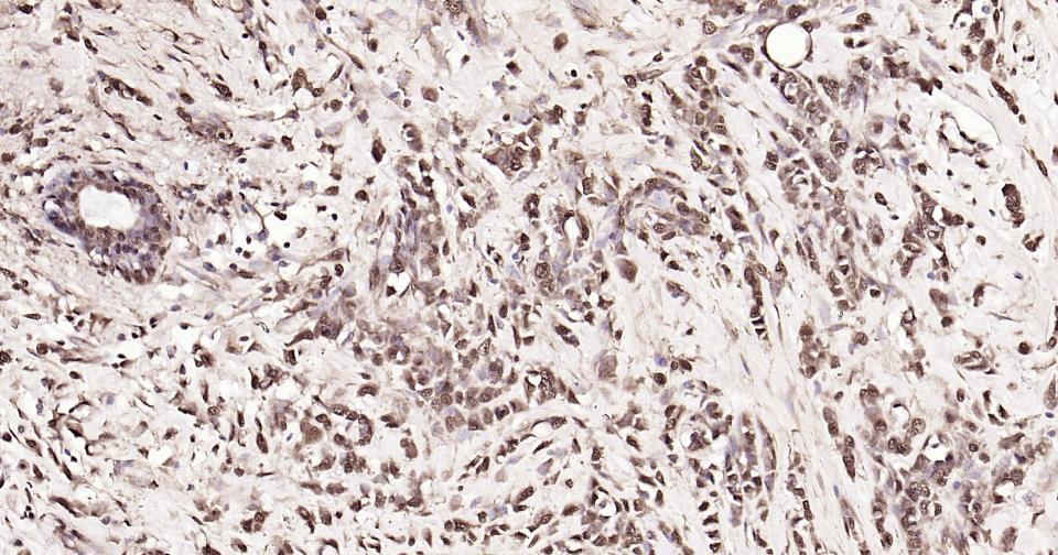 Paraformaldehyde-fixed, paraffin embedded Human Breast Cancer; Antigen retrieval by boiling in sodium citrate buffer (pH6.0) for 15 min; Antibody incubation with PTEN Monoclonal Antibody, Unconjugated(bsm-33320M) at 1:200 overnight at 4°C, followed by conjugation to the bs-40296G-HRP and DAB (C-0010) staining.