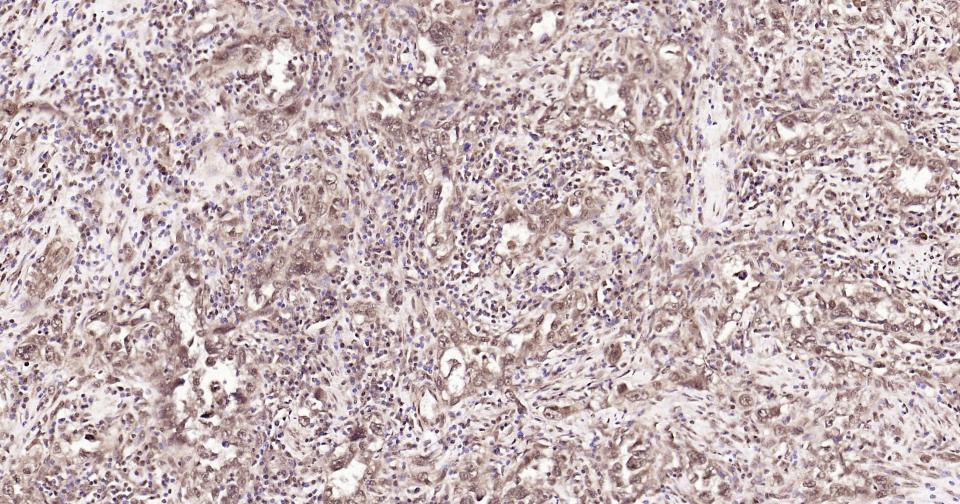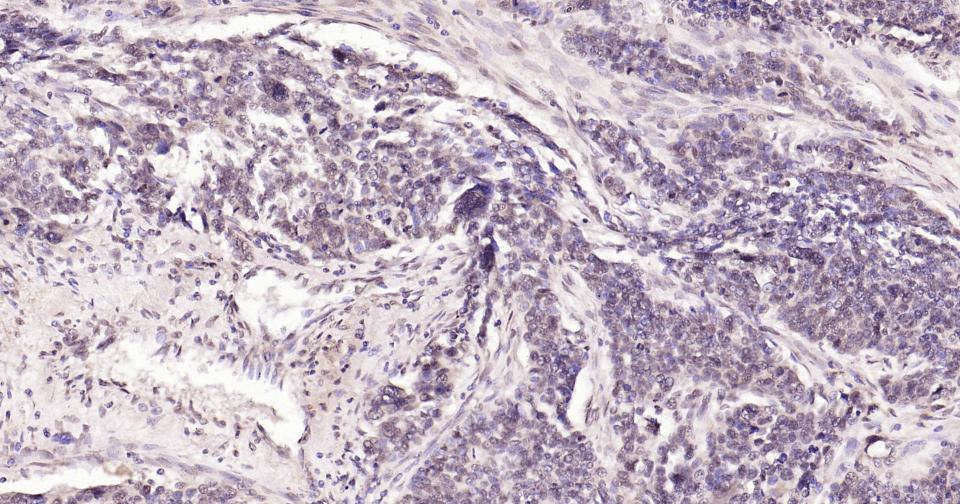 Paraformaldehyde-fixed, paraffin embedded Human Lung Cancer; Antigen retrieval by boiling in sodium citrate buffer (pH6.0) for 15 min; Antibody incubation with PTEN Monoclonal Antibody, Unconjugated(bsm-33320M) at 1:200 overnight at 4°C, followed by conjugation to the bs-40296G-HRP and DAB (C-0010) staining.