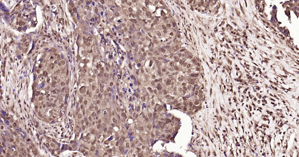 Paraformaldehyde-fixed, paraffin embedded Human Cervical Cancer; Antigen retrieval by boiling in sodium citrate buffer (pH6.0) for 15 min; Antibody incubation with PTEN Monoclonal Antibody, Unconjugated(bsm-33320M) at 1:200 overnight at 4°C, followed by conjugation to the bs-40296G-HRP and DAB (C-0010) staining.