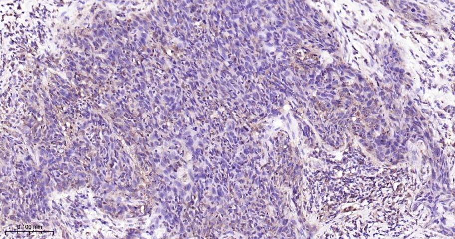 Paraformaldehyde-fixed, paraffin embedded Human Cervical Cancer; Antigen retrieval by boiling in sodium citrate buffer (pH6.0) for 15 min; The section was incubated with STAT3 Monoclonal Antibody, Unconjugated (ascites of bsm-33223M) at 1:1500 overnight at 4°C, followed by conjugation to the bs-40296G-HRP and DAB (C-0010) staining.