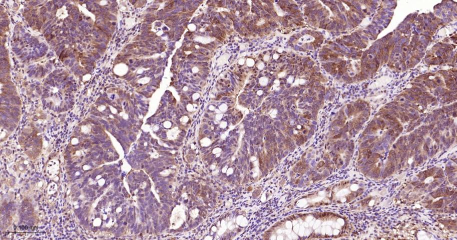 Paraformaldehyde-fixed, paraffin embedded Human Colon Cancer; Antigen retrieval by boiling in sodium citrate buffer (pH6.0) for 15 min; The section was incubated with STAT3 Monoclonal Antibody, Unconjugated (ascites of bsm-33223M) at 1:1500 overnight at 4°C, followed by conjugation to the bs-40296G-HRP and DAB (C-0010) staining.
