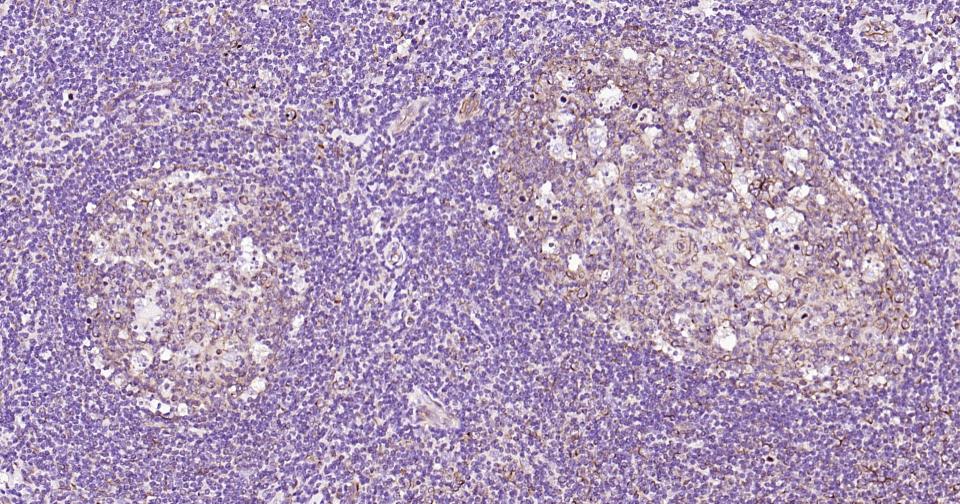 Paraformaldehyde-fixed, paraffin embedded Human Tonsil; Antigen retrieval by boiling in sodium citrate buffer (pH6.0) for 15 min; Antibody incubation with Beta tubulin Monoclonal Antibody, Unconjugated(bsm-33120M) at 1:200 overnight at 4°C, followed by conjugation to the SP Kit (Mouse, sp-0024) and DAB (C-0010) staining.