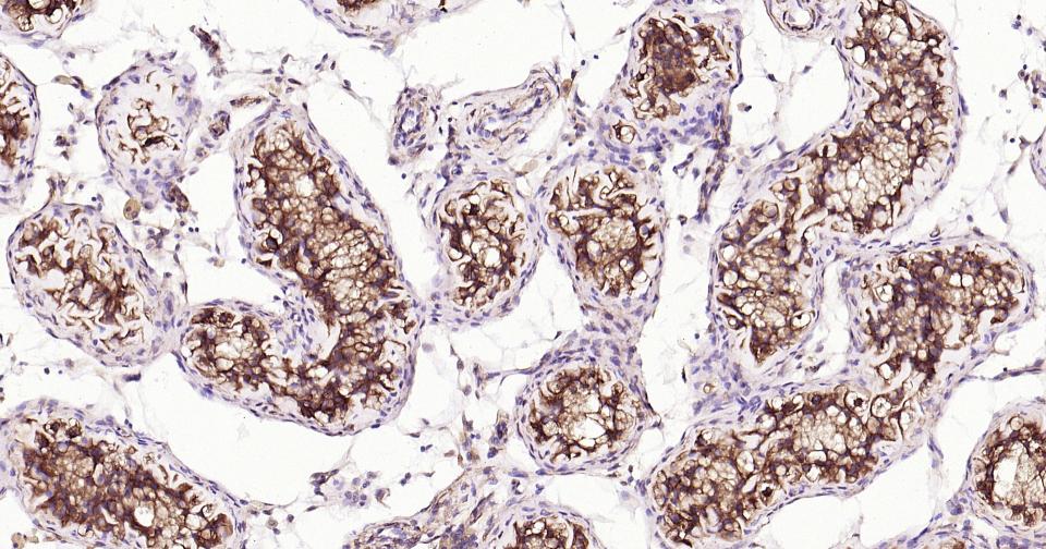 Paraformaldehyde-fixed, paraffin embedded Human Testicles; Antigen retrieval by boiling in sodium citrate buffer (pH6.0) for 15 min; Antibody incubation with Beta tubulin Monoclonal Antibody, Unconjugated(bsm-33120M) at 1:200 overnight at 4°C, followed by conjugation to the SP Kit (Mouse, sp-0024) and DAB (C-0010) staining.