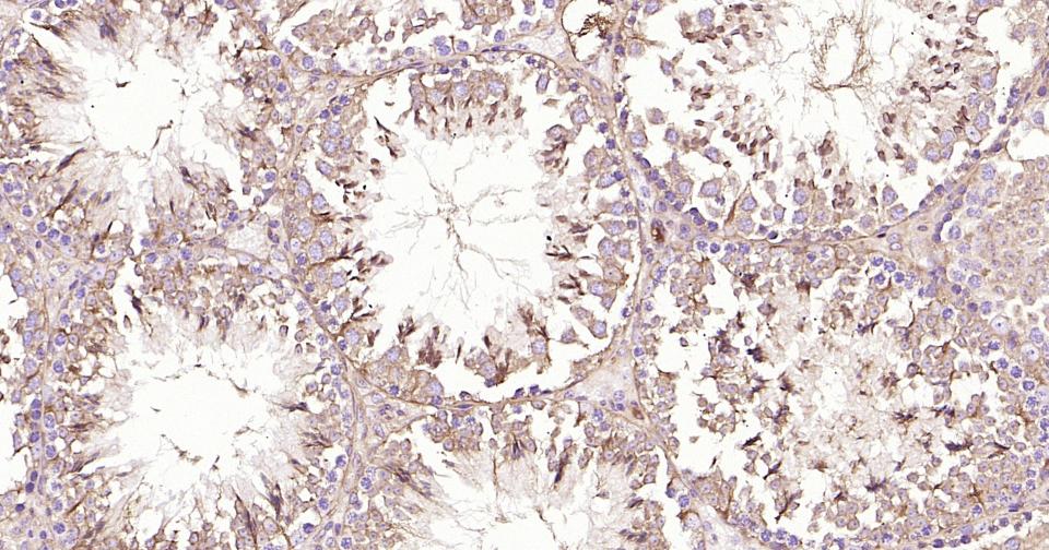 Paraformaldehyde-fixed, paraffin embedded Rat Testicles; Antigen retrieval by boiling in sodium citrate buffer (pH6.0) for 15 min; Antibody incubation with Beta tubulin Monoclonal Antibody, Unconjugated(bsm-33120M) at 1:200 overnight at 4°C, followed by conjugation to the SP Kit (Mouse, sp-0024) and DAB (C-0010) staining.