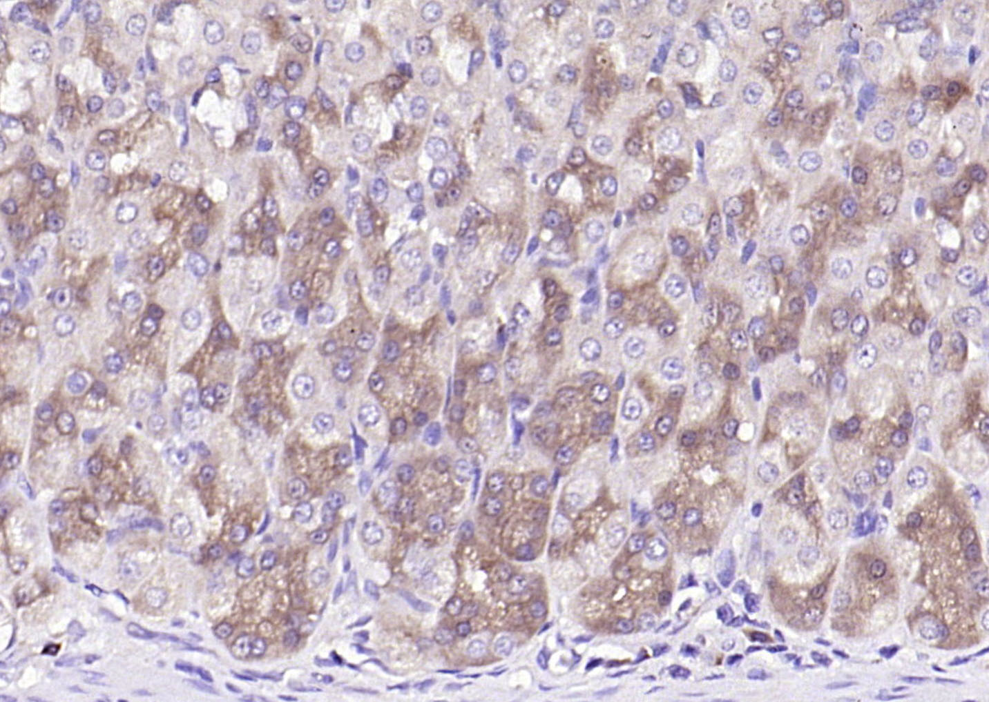 Paraformaldehyde-fixed, paraffin embedded (rat stomach); Antigen retrieval by boiling in sodium citrate buffer (pH6.0) for 15min; Block endogenous peroxidase by 3% hydrogen peroxide for 20 minutes; Blocking buffer (normal goat serum) at 37°C for 30min; Antibody incubation with (ATG5) Monoclonal Antibody, Unconjugated (ascites of bsm-33385M 5D7) at 1:2000 overnight at 4°C, followed by operating according to SP Kit(Mouse) (sp-0024) instructions and DAB staining.