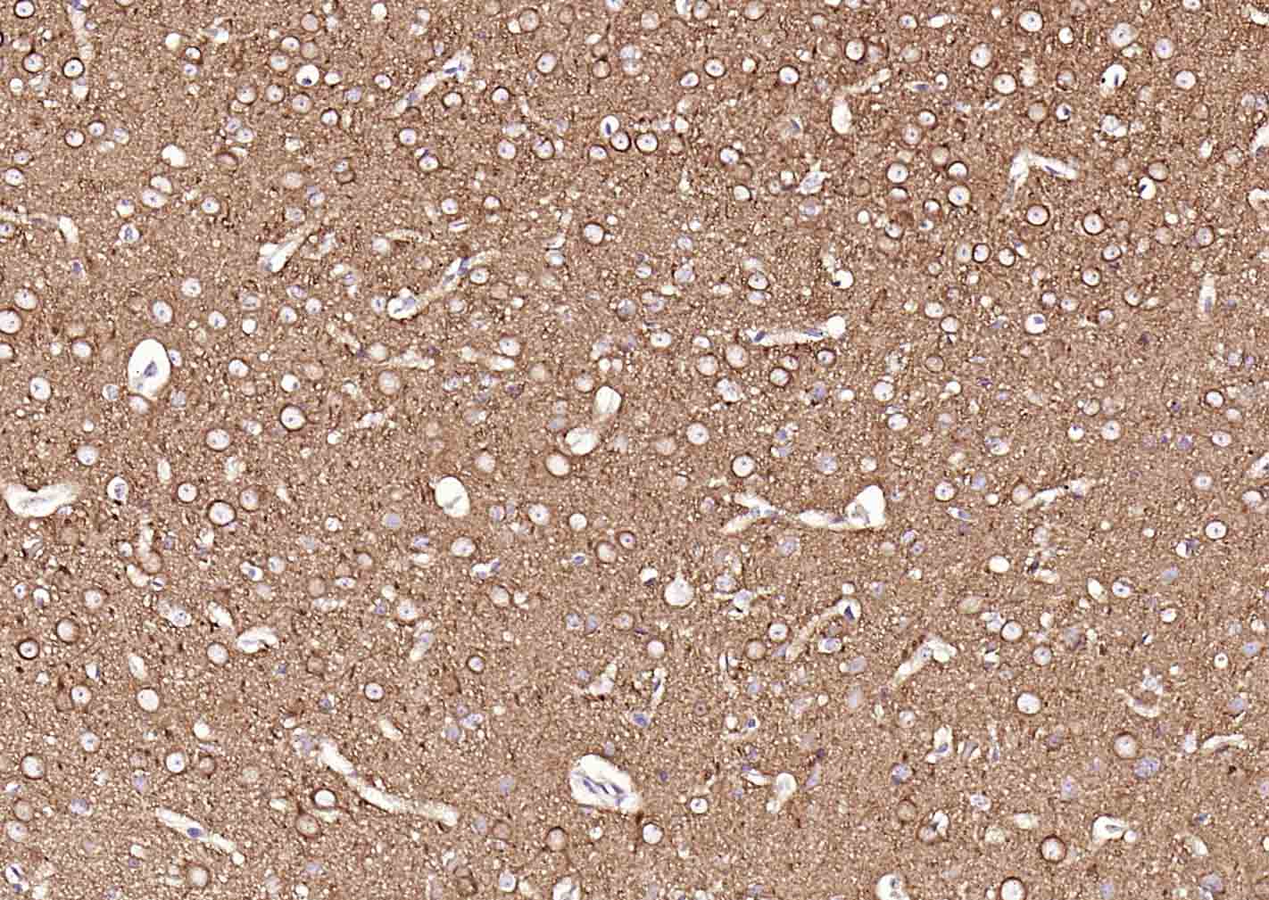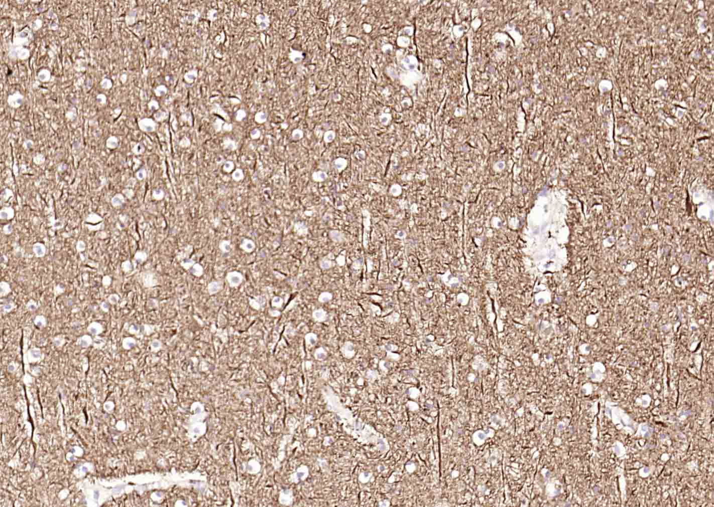 Paraformaldehyde-fixed, paraffin embedded (Human left parietal lobe); Antigen retrieval by boiling in sodium citrate buffer (pH6.0) for 15min; Block endogenous peroxidase by 3% hydrogen peroxide for 20 minutes; Blocking buffer (normal goat serum) at 37°C for 30min; Incubation with (TUBB3 (Neuronal Marker) ) Monoclonal Antibody, Unconjugated (bsm-33177M) at 1:200 overnight at 4°C, followed by operating according to SP Kit(Mouse)(sp-0024) instructionsand DAB staining.