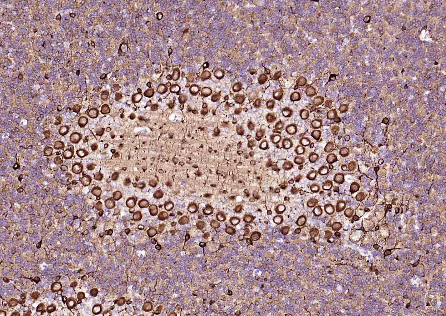 Paraformaldehyde-fixed, paraffin embedded (rat cerebellum); Antigen retrieval by boiling in sodium citrate buffer (pH6.0) for 15min; Block endogenous peroxidase by 3% hydrogen peroxide for 20 minutes; Blocking buffer (normal goat serum) at 37°C for 30min; Incubation with (TUBB3 (Neuronal Marker) ) Monoclonal Antibody, Unconjugated (bsm-33177M) at 1:200 overnight at 4°C, followed by operating according to SP Kit(Mouse)(sp-0024) instructionsand DAB staining.