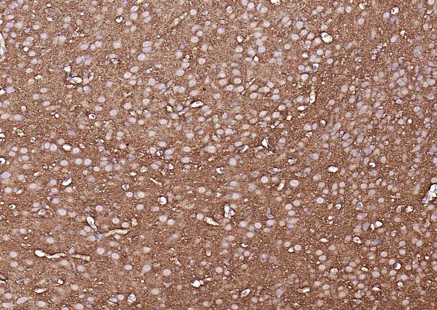Paraformaldehyde-fixed, paraffin embedded (rat brain); Antigen retrieval by boiling in sodium citrate buffer (pH6.0) for 15min; Block endogenous peroxidase by 3% hydrogen peroxide for 20 minutes; Blocking buffer (normal goat serum) at 37°C for 30min; Incubation with (TUBB3 (Neuronal Marker) ) Monoclonal Antibody, Unconjugated (bsm-33177M) at 1:200 overnight at 4°C, followed by operating according to SP Kit(Mouse)(sp-0024) instructionsand DAB staining.