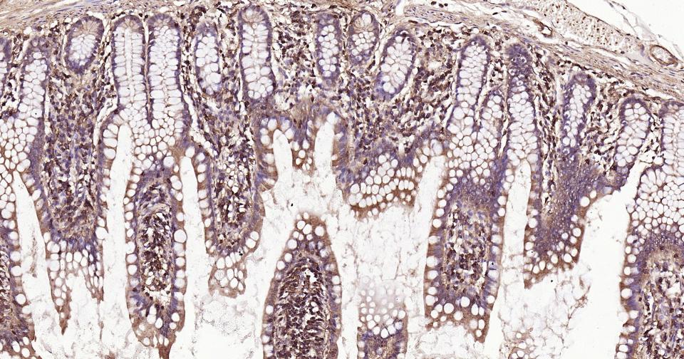 Paraformaldehyde-fixed, paraffin embedded Mouse Colon; Antigen retrieval by boiling in sodium citrate buffer (pH6.0) for 15 min; Antibody incubation with beta-Actin Polyclonal Antibody, Unconjugated (bs-0061R) at 1:200 overnight at 4°C, followed by conjugation to the SP Kit (Rabbit, SP-0023) and DAB (C-0010) staining.