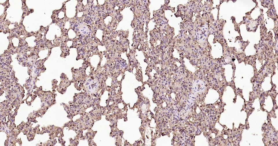Paraformaldehyde-fixed, paraffin embedded Mouse Lung; Antigen retrieval by boiling in sodium citrate buffer (pH6.0) for 15 min; Antibody incubation with beta-Actin Polyclonal Antibody, Unconjugated (bs-0061R) at 1:200 overnight at 4°C, followed by conjugation to the SP Kit (Rabbit, SP-0023) and DAB (C-0010) staining.