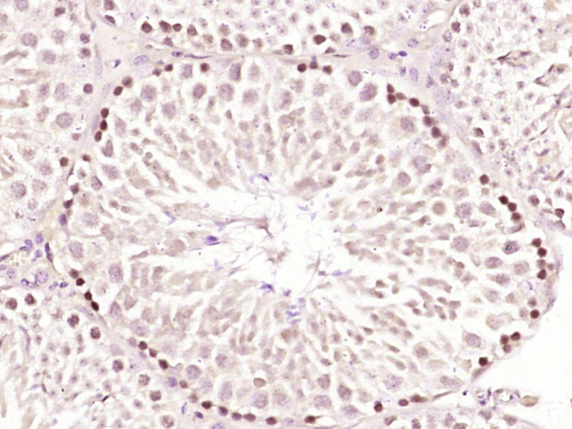 Paraformaldehyde-fixed, paraffin embedded (Mouse testis); Antigen retrieval by boiling in sodium citrate buffer (pH6.0) for 15min; Block endogenous peroxidase by 3% hydrogen peroxide for 20 minutes; Blocking buffer (normal goat serum) at 37°C for 30min; Antibody incubation with (TBX22) Polyclonal Antibody, Unconjugated (bs-24075R) at 1:400 overnight at 4°C, followed by operating according to SP Kit(Rabbit) (sp-0023) instructionsand DAB staining.