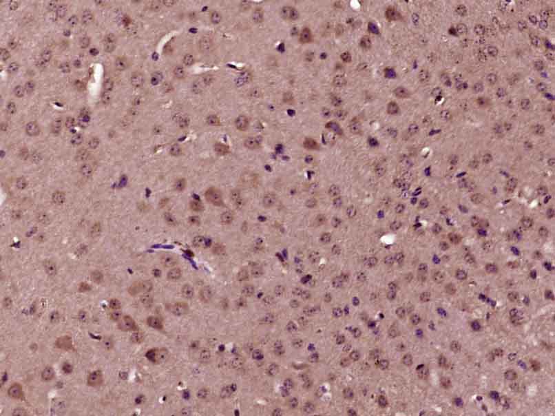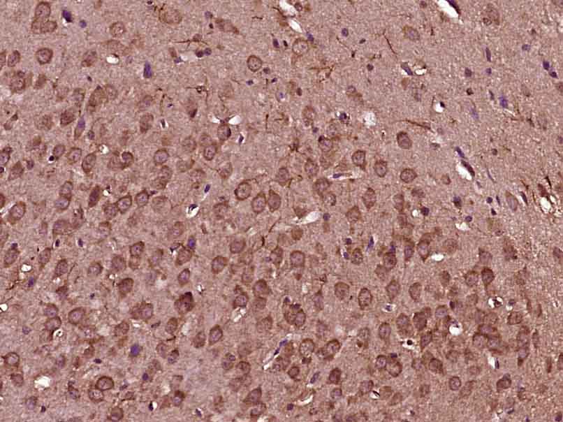 Paraformaldehyde-fixed, paraffin embedded (Rat brain); Antigen retrieval by boiling in sodium citrate buffer (pH6.0) for 15min; Block endogenous peroxidase by 3% hydrogen peroxide for 20 minutes; Blocking buffer (normal goat serum) at 37°C for 30min; Antibody incubation with (TIMP-1) Monoclonal Antibody, Unconjugated (bsm-10895M) at 1:400 overnight at 4°C, followed by operating according to SP Kit(Mouse) (sp-0024) instructionsand DAB staining.