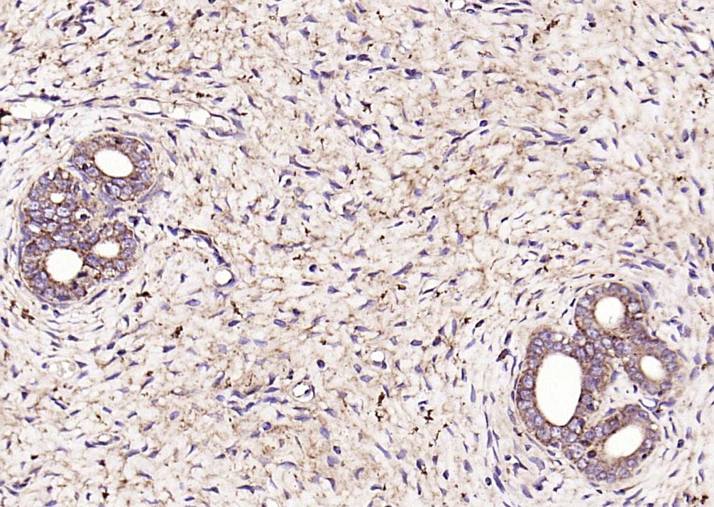 Paraformaldehyde-fixed, paraffin embedded (rat uterus); Antigen retrieval by boiling in sodium citrate buffer (pH6.0) for 15min; Block endogenous peroxidase by 3% hydrogen peroxide for 20 minutes; Blocking buffer (normal goat serum) at 37°C for 30min; Antibody incubation with (SOD2) Polyclonal Antibody, Unconjugated (bs-23402R) at 1:200 overnight at 4°C, followed by operating according to SP Kit(Rabbit) (sp-0023) instructionsand DAB staining.