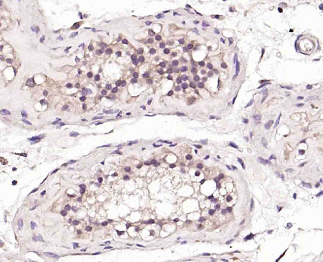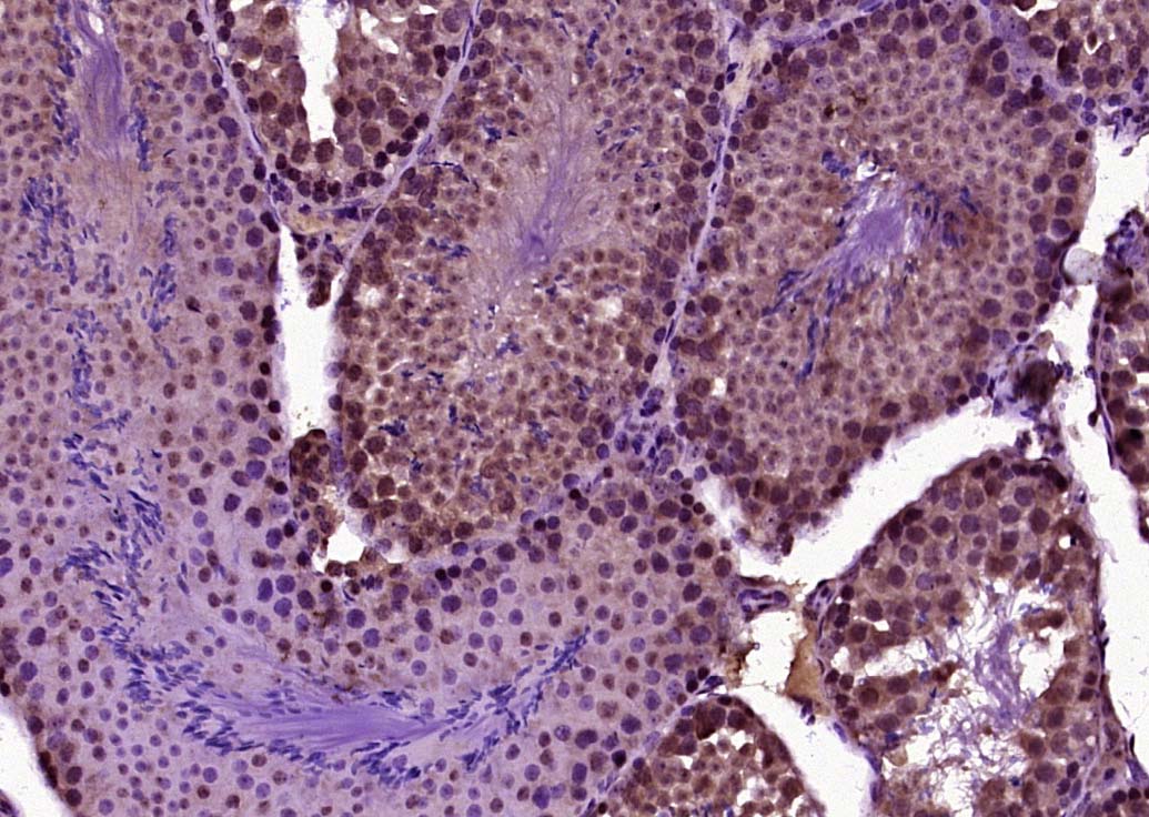 Paraformaldehyde-fixed, paraffin embedded (Human testis); Antigen retrieval by boiling in sodium citrate buffer (pH6.0) for 15min; Block endogenous peroxidase by 3% hydrogen peroxide for 20 minutes; Blocking buffer (normal goat serum) at 37°C for 30min; Incubation with (BNC1) Polyclonal Antibody, Unconjugated (bs-20583R) at 1:200 overnight at 4°C, followed by operating according to SP Kit(Rabbit) (sp-0023) instructionsand DAB staining.