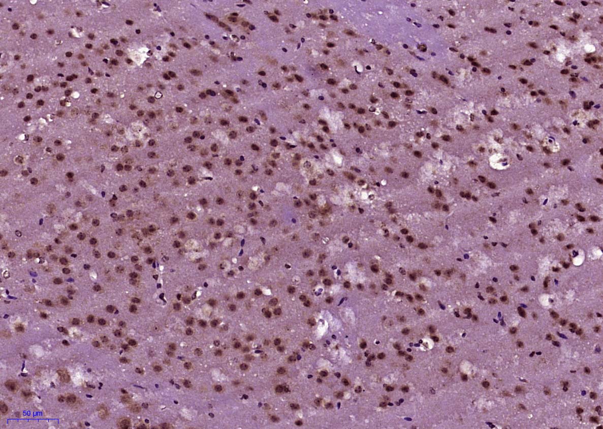 Paraformaldehyde-fixed, paraffin embedded (Mouse brain); Antigen retrieval by boiling in sodium citrate buffer (pH6.0) for 15min; Block endogenous peroxidase by 3% hydrogen peroxide for 20 minutes; Blocking buffer (normal goat serum) at 37°C for 30min; Antibody incubation with (BNC1) Polyclonal Antibody, Unconjugated (bs-20583R) at 1:400 overnight at 4°C, followed by operating according to SP Kit(Rabbit) (sp-0023) instructionsand DAB staining.