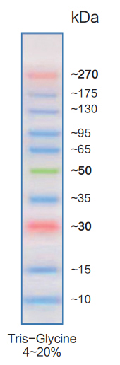 產(chǎn)品簡(jiǎn)介: 本產(chǎn)品由跨度從10 ~270 kDa的10種純化的天然蛋白混合而成,各條帶濃度約為0.1~0.5 mg/ml。其中30 kDa和270 kDa條帶為加強(qiáng)條帶,方便判斷各個(gè)條帶的準(zhǔn)確位置。本產(chǎn)品適合作為SDS-PAGE電泳時(shí),變性蛋白樣品的分子量參照,并可實(shí)時(shí)觀察蛋白樣品的電泳分離狀況,也可用于檢測(cè)Western blot的轉(zhuǎn)膜效率。由于共價(jià)結(jié)合的染料會(huì)影響蛋白質(zhì)分子的電泳遷移率,本產(chǎn)品僅適于粗略地估計(jì)目的蛋白樣品的分子量。 使用說(shuō)明: 1. 將本產(chǎn)品于室溫融化后,輕輕混勻,使沉淀充分溶解。 2. 上樣5ul,SDS-PAGE電泳過(guò)程及轉(zhuǎn)膜后可看見(jiàn)清晰的彩色條帶。 3. 建議依據(jù)待測(cè)蛋白分子量選擇合適的分離膠濃度。 注意事項(xiàng): 1. 使用時(shí)應(yīng)該將從低溫取出后的產(chǎn)品恢復(fù)至室溫后混勻,然后再上樣,否則可能由于低溫下蛋白變性不徹底導(dǎo)致電泳條帶出現(xiàn)不同程度的彌散或拖帶。 2. 轉(zhuǎn)膜效果與轉(zhuǎn)膜時(shí)間有關(guān),需根據(jù)客戶目的條帶大小而定,如果轉(zhuǎn)膜后較大分子量條帶有部分未轉(zhuǎn)膜成功,屬于正?,F(xiàn)象。 3. 本產(chǎn)品含有SDS,蛋白已變性,不宜作為天然蛋白分子電泳時(shí)的分子量參照標(biāo)準(zhǔn)。 |