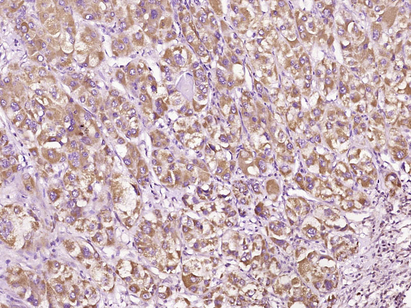Paraformaldehyde-fixed, paraffin embedded (Human liver carcinoma); Antigen retrieval by boiling in sodium citrate buffer (pH6.0) for 15min; Block endogenous peroxidase by 3% hydrogen peroxide for 20 minutes; Blocking buffer (normal goat serum) at 37°C for 30min; Antibody incubation with (IFN-Beta/Ifnb1) Polyclonal Antibody, Unconjugated (bs-23730R) at 1:400 overnight at 4°C, followed by operating according to SP Kit(Rabbit) (sp-0023) instructionsand DAB staining.