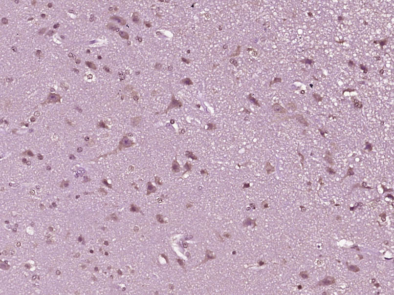 Paraformaldehyde-fixed, paraffin embedded (mouse brain tissue); Antigen retrieval by boiling in sodium citrate buffer (pH6.0) for 15min; Block endogenous peroxidase by 3% hydrogen peroxide for 20 minutes; Blocking buffer (normal goat serum) at 37°C for 30min; Antibody incubation with (MDM2) Polyclonal Antibody, Unconjugated (bs-23748R) at 1:400 overnight at 4°C, followed by operating according to SP Kit(Rabbit) (sp-0023) instructionsand DAB staining.