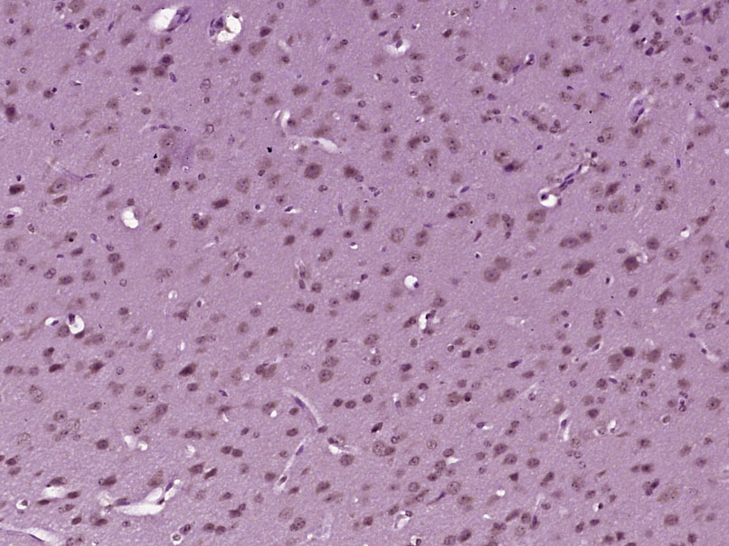 Paraformaldehyde-fixed, paraffin embedded (Mouse brain); Antigen retrieval by boiling in sodium citrate buffer (pH6.0) for 15min; Block endogenous peroxidase by 3% hydrogen peroxide for 20 minutes; Blocking buffer (normal goat serum) at 37°C for 30min; Antibody incubation with (MDM2) Polyclonal Antibody, Unconjugated (bs-23748R) at 1:400 overnight at 4°C, followed by operating according to SP Kit(Rabbit) (sp-0023) instructionsand DAB staining.