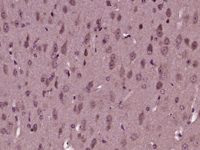 Paraformaldehyde-fixed, paraffin embedded (mouse brain tissue); Antigen retrieval by boiling in sodium citrate buffer (pH6.0) for 15min; Block endogenous peroxidase by 3% hydrogen peroxide for 20 minutes; Blocking buffer (normal goat serum) at 37°C for 30min; Antibody incubation with (TBC1D4) Polyclonal Antibody, Unconjugated (bs-23728R) at 1:400 overnight at 4°C, followed by operating according to SP Kit(Rabbit) (sp-0023) instructionsand DAB staining.