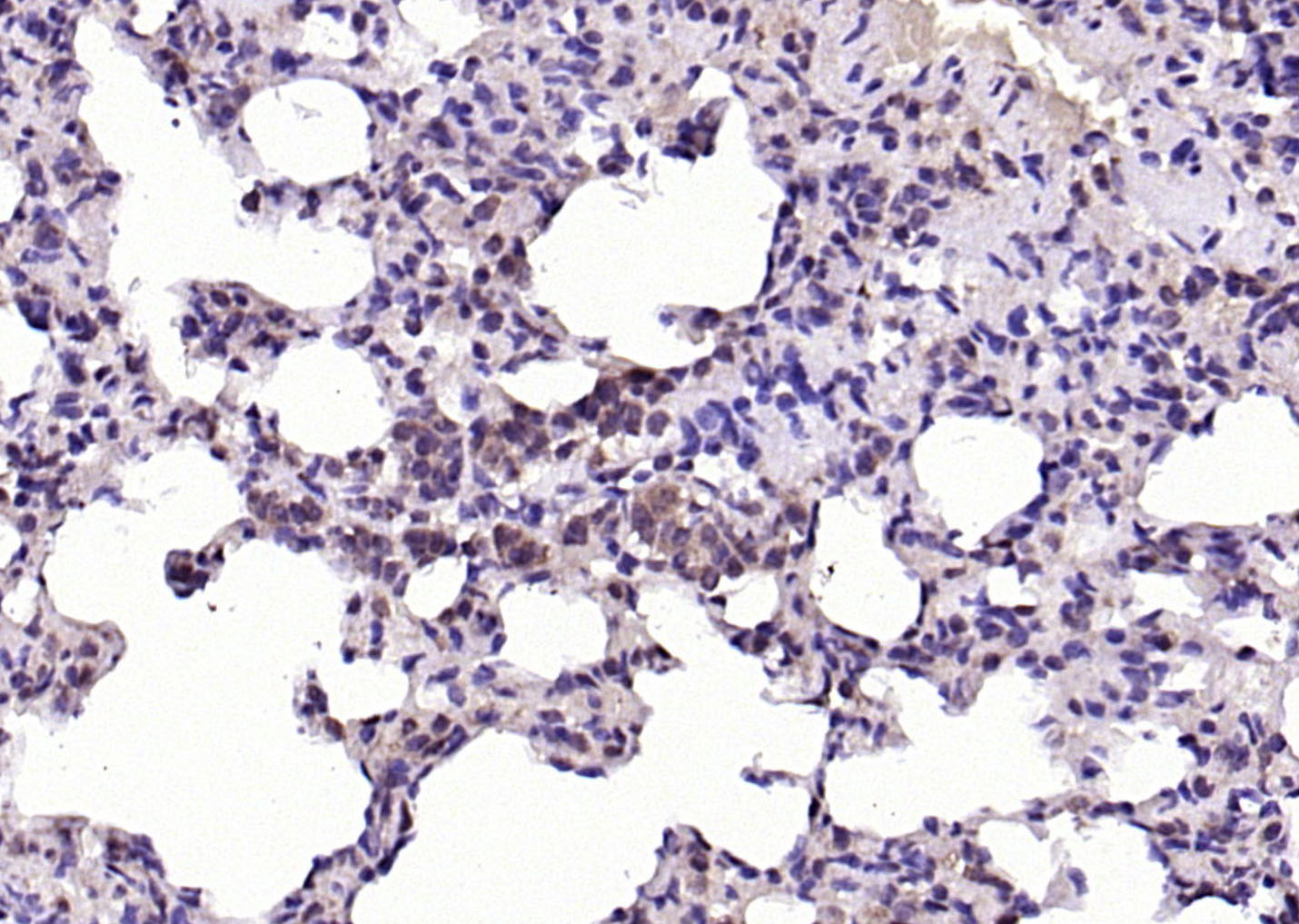 Paraformaldehyde-fixed, paraffin embedded (mouse lung); Antigen retrieval by boiling in sodium citrate buffer (pH6.0) for 15min; Block endogenous peroxidase by 3% hydrogen peroxide for 20 minutes; Blocking buffer (normal goat serum) at 37°C for 30min; Antibody incubation with (IRF-1) Polyclonal Antibody, Unconjugated (bs-21318R) at 1:200 overnight at 4°C, followed by operating according to SP Kit(Rabbit) (sp-0023) instructionsand DAB staining.