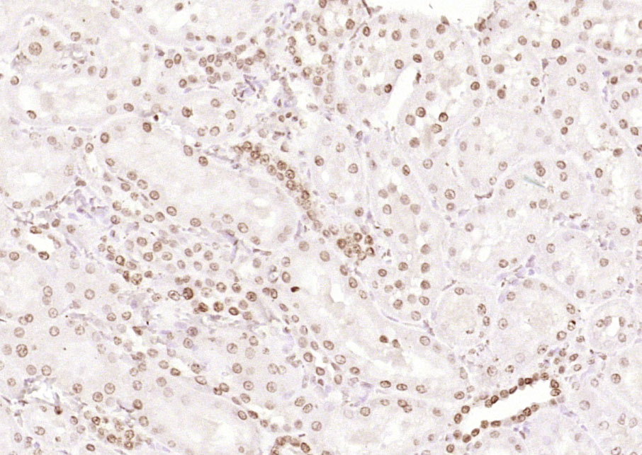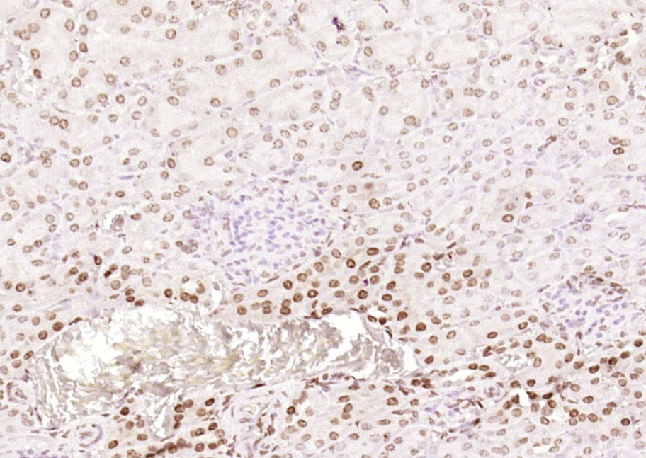 Paraformaldehyde-fixed, paraffin embedded (rat kidney); Antigen retrieval by boiling in sodium citrate buffer (pH6.0) for 15min; Block endogenous peroxidase by 3% hydrogen peroxide for 20 minutes; Blocking buffer (normal goat serum) at 37°C for 30min; Antibody incubation with (Islet-1) Polyclonal Antibody, Unconjugated (bs-7346R) at 1:200 overnight at 4°C, followed by operating according to SP Kit(Rabbit) (sp-0023) instructionsand DAB staining.