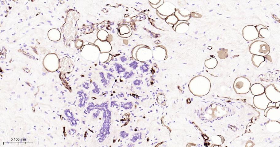 Paraformaldehyde-fixed, paraffin embedded Human Breast; Antigen retrieval by boiling in sodium citrate buffer (pH6.0) for 15 min; The section was incubated with FABP4 Monoclonal Antibody, Unconjugated (bsm-51247M) at 1:200 overnight at 4°C, followed by conjugation to the bs-40296G-HRP and DAB (C-0010) staining.