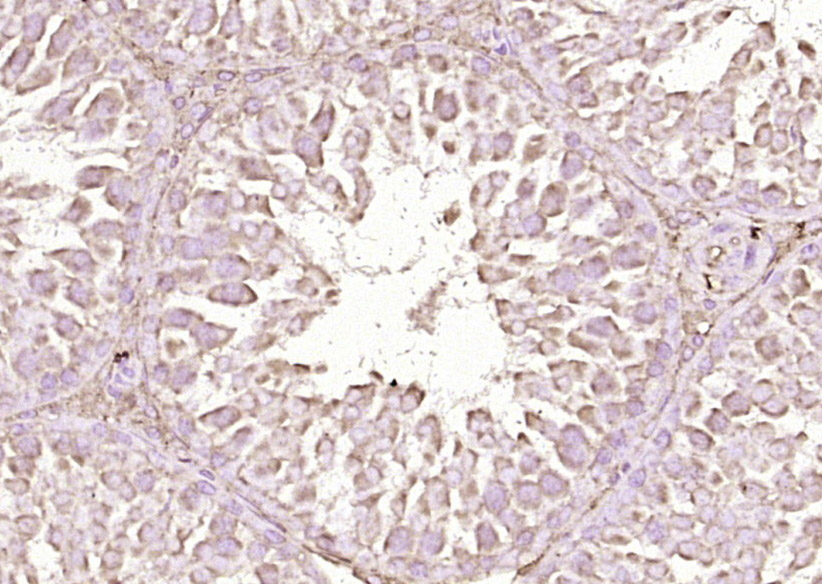 Paraformaldehyde-fixed, paraffin embedded (rat testis tissue); Antigen retrieval by boiling in sodium citrate buffer (pH6.0) for 15min; Block endogenous peroxidase by 3% hydrogen peroxide for 20 minutes; Blocking buffer (normal goat serum) at 37°C for 30min; Antibody incubation with (RSPO1) Polyclonal Antibody, Unconjugated (bs-21385R) at 1:200 overnight at 4°C, followed by operating according to SP Kit(Rabbit) (sp-0023) instructionsand DAB staining.