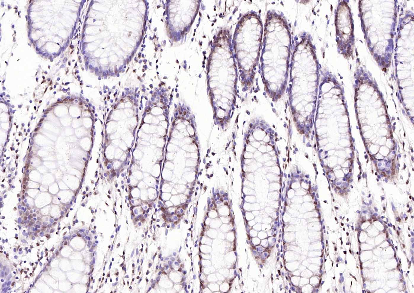 Paraformaldehyde-fixed, paraffin embedded (human colon); Antigen retrieval by boiling in sodium citrate buffer (pH6.0) for 15min; Block endogenous peroxidase by 3% hydrogen peroxide for 20 minutes; Blocking buffer (normal goat serum) at 37°C for 30min; Incubation with (BRD2 ) Polyclonal Antibody, Unconjugated (bs-21544R) at 1:200 overnight at 4°C, followed by operating according to SP Kit(Rabbit) (sp-0023) instructionsand DAB staining.