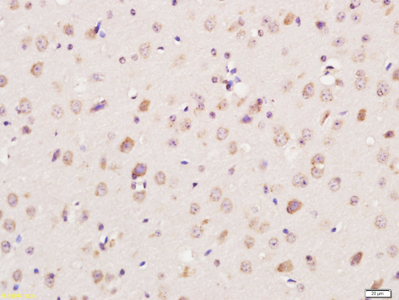 Paraformaldehyde-fixed, paraffin embedded (mouse brain); Antigen retrieval by boiling in sodium citrate buffer (pH6.0) for 15min; Block endogenous peroxidase by 3% hydrogen peroxide for 20 minutes; Blocking buffer (normal goat serum) at 37°C for 30min; Antibody incubation with (Ceramide glucosyltransferase) Polyclonal Antibody, Unconjugated (bs-21562R) at 1:200 overnight at 4°C, followed by operating according to SP Kit(Rabbit) (sp-0023) instructionsand DAB staining.