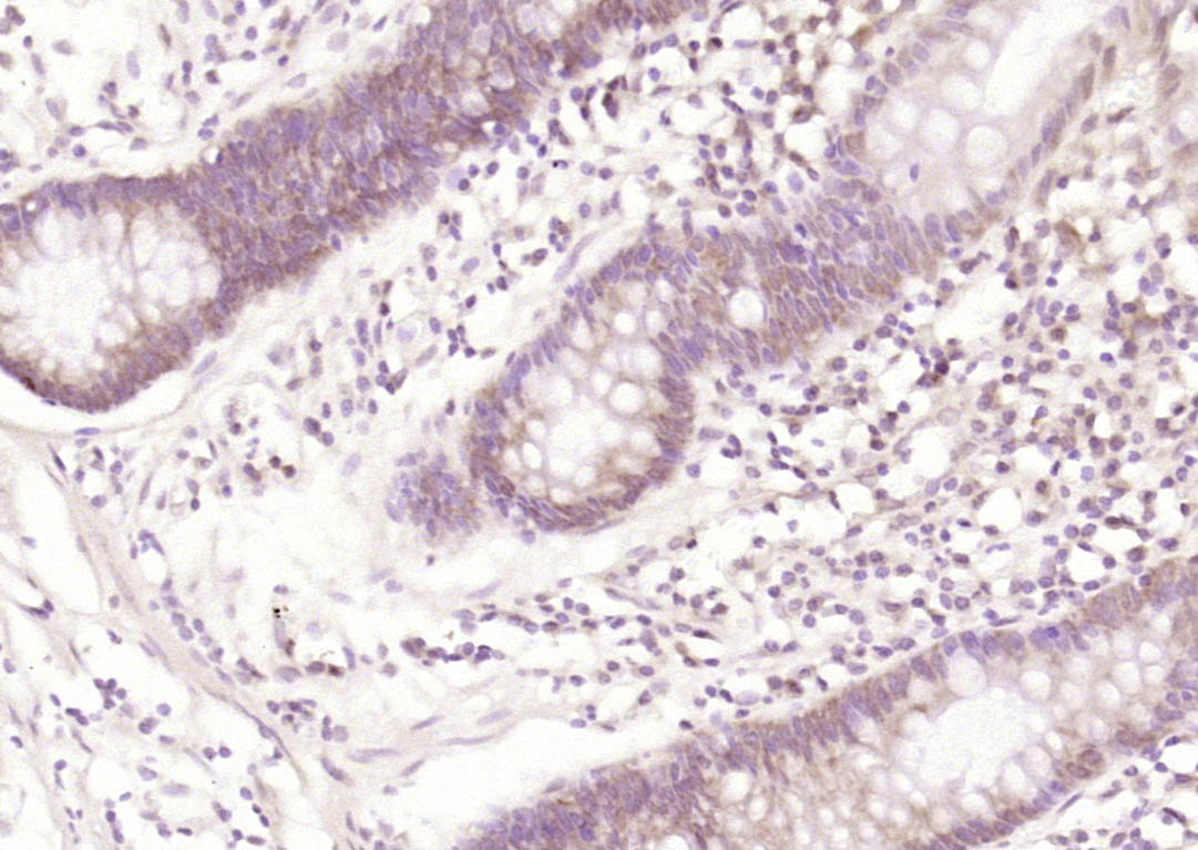 Paraformaldehyde-fixed, paraffin embedded (human rectal carcinoma); Antigen retrieval by boiling in sodium citrate buffer (pH6.0) for 15min; Block endogenous peroxidase by 3% hydrogen peroxide for 20 minutes; Blocking buffer (normal goat serum) at 37°C for 30min; Antibody incubation with (CTNND2 delta 2 Catenin) Polyclonal Antibody, Unconjugated (bs-22251R) at 1:400 overnight at 4°C, followed by operating according to SP Kit(Rabbit) (sp-0023) instructionsand DAB staining.