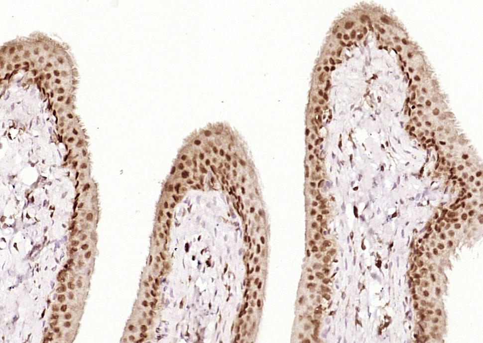 Paraformaldehyde-fixed, paraffin embedded (rat bladder); Antigen retrieval by boiling in sodium citrate buffer (pH6.0) for 15min; Block endogenous peroxidase by 3% hydrogen peroxide for 20 minutes; Blocking buffer (normal goat serum) at 37°C for 30min; Antibody incubation with (Phospho-MSK1 (Ser376)) Polyclonal Antibody, Unconjugated (bsm-52123R) at 1:200 overnight at 4°C, followed by operating according to SP Kit(Rabbit) (sp-0023) instructionsand DAB staining.