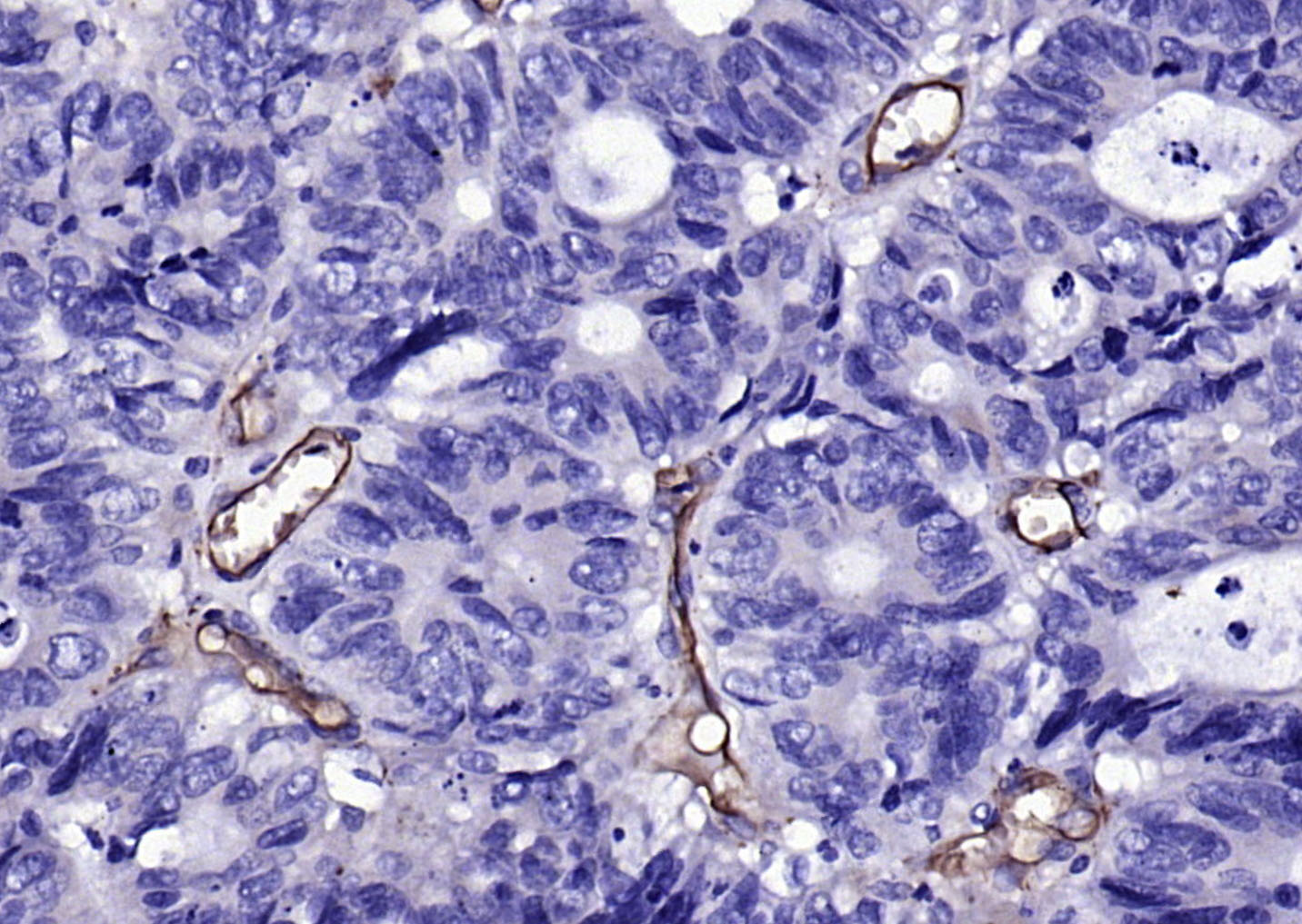 Paraformaldehyde-fixed, paraffin embedded (human colon carcinoma); Antigen retrieval by boiling in sodium citrate buffer (pH6.0) for 15min; Block endogenous peroxidase by 3% hydrogen peroxide for 20 minutes; Blocking buffer (normal goat serum) at 37°C for 30min; Antibody incubation with (CD105) Polyclonal Antibody, Unconjugated (bs-41201R) at 1:200 overnight at 4°C, followed by operating according to SP Kit(Rabbit) (sp-0023) instructionsand DAB staining.