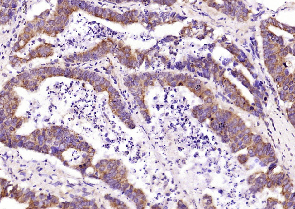 Paraformaldehyde-fixed, paraffin embedded (human colon carcinoma); Antigen retrieval by boiling in sodium citrate buffer (pH6.0) for 15min; Block endogenous peroxidase by 3% hydrogen peroxide for 20 minutes; Blocking buffer (normal goat serum) at 37°C for 30min; Antibody incubation with (IKK gamma) Polyclonal Antibody, Unconjugated (bs-22575R) at 1:200 overnight at 4°C, followed by operating according to SP Kit(Rabbit) (sp-0023) instructionsand DAB staining.