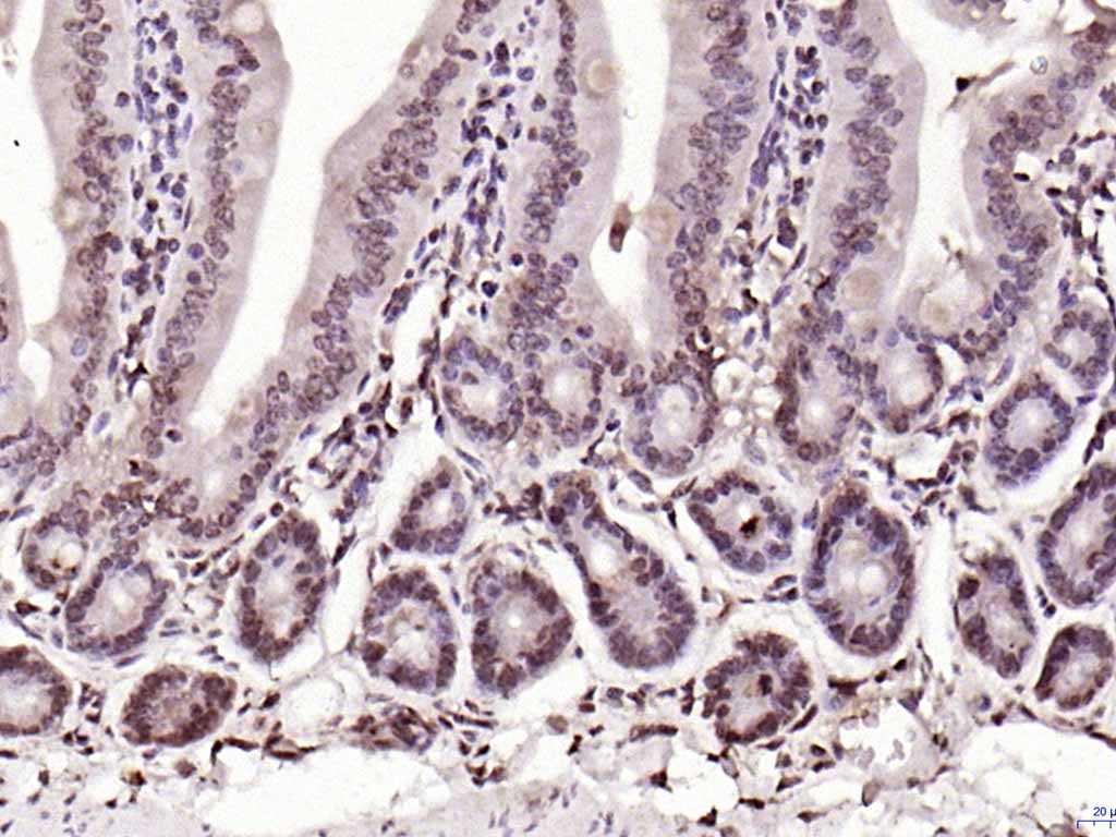 Paraformaldehyde-fixed, paraffin embedded (mouse intestine); Antigen retrieval by boiling in sodium citrate buffer (pH6.0) for 15min; Block endogenous peroxidase by 3% hydrogen peroxide for 20 minutes; Blocking buffer (normal goat serum) at 37°C for 30min; Antibody incubation with (BLM ) Polyclonal Antibody, Unconjugated (bs-22614R) at 1:400 overnight at 4°C, followed by operating according to SP Kit(Rabbit) (sp-0023) instructionsand DAB staining.