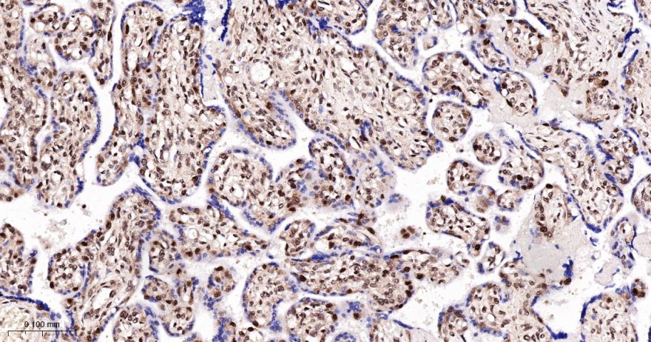 Paraformaldehyde-fixed, paraffin embedded Human Placenta; Antigen retrieval by boiling in sodium citrate buffer (pH6.0) for 15 min; The section was incubated with Cyclin E1 Monoclonal Antibody, Unconjugated (bsm-52048R) at 1:200 overnight at 4°C, followed by conjugation to the bs-0295G-HRP and DAB (C-0010) staining.
