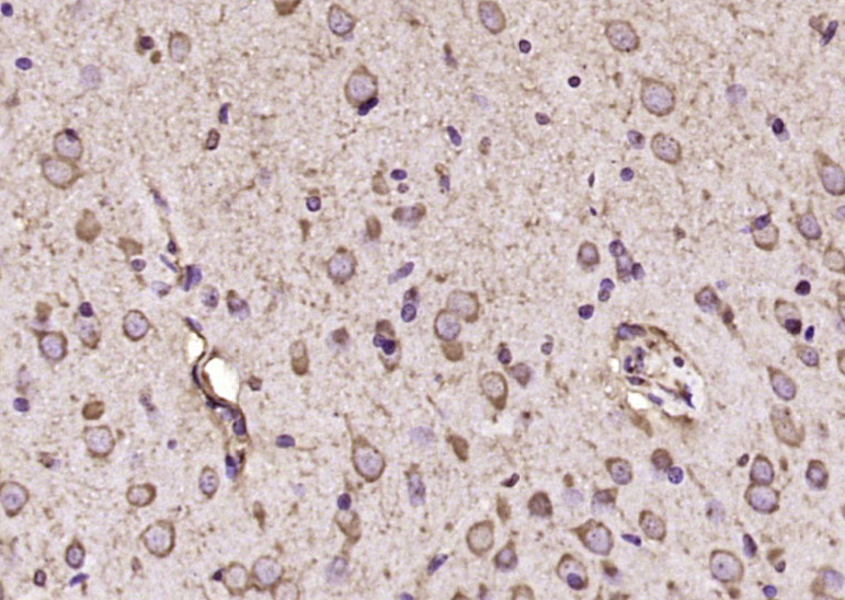 Paraformaldehyde-fixed, paraffin embedded (rat brain); Antigen retrieval by boiling in sodium citrate buffer (pH6.0) for 15min; Block endogenous peroxidase by 3% hydrogen peroxide for 20 minutes; Blocking buffer (normal goat serum) at 37°C for 30min; Antibody incubation with (AMPK alpha 2) Polyclonal Antibody, Unconjugated (bs-22270R) at 1:200 overnight at 4°C, followed by operating according to SP Kit(Rabbit) (sp-0023) instructionsand DAB staining.