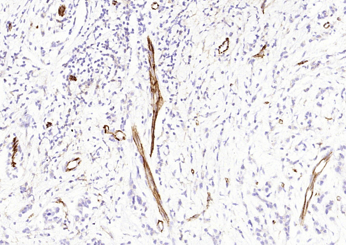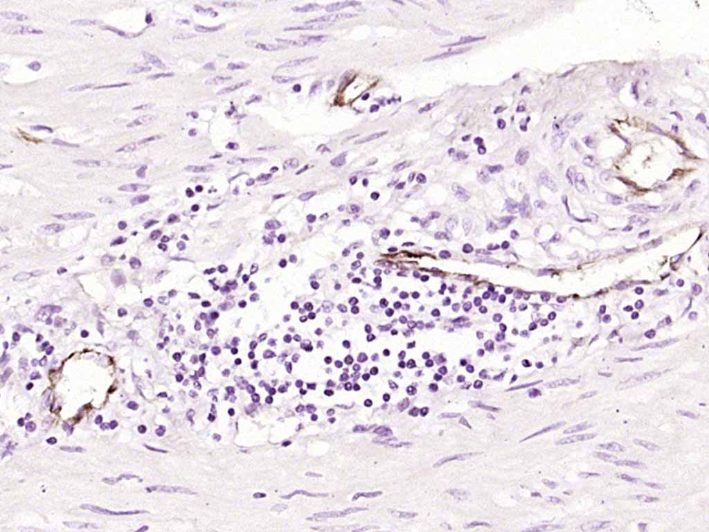 Paraformaldehyde-fixed, paraffin embedded (human tonsil); Antigen retrieval by boiling in sodium citrate buffer (pH6.0) for 15min; Block endogenous peroxidase by 3% hydrogen peroxide for 20 minutes; Blocking buffer (normal goat serum) at 37°C for 30min; Antibody incubation with (CD31) Monoclonal Antibody, Unconjugated (BH0190) overnight at 4°C, followed by operating according to SP Kit(Mouse)(sp-0024) instructionsand DAB staining.