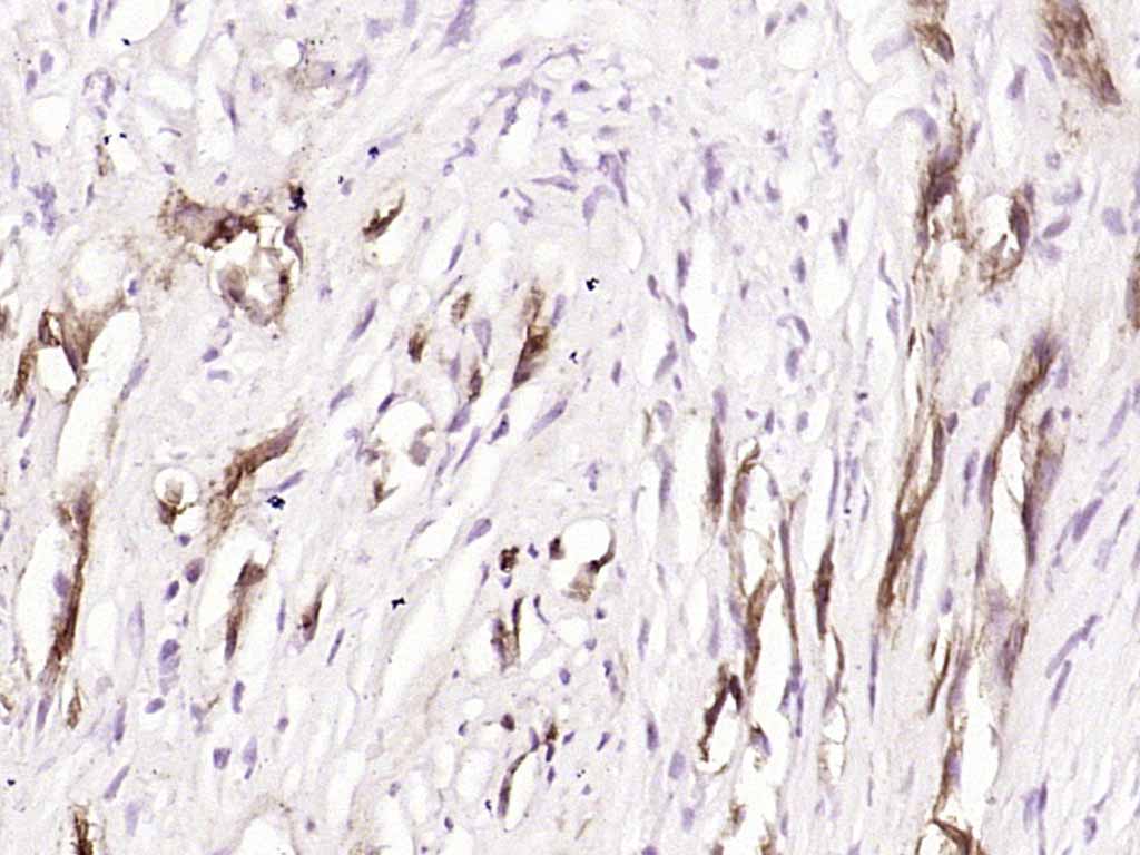 Paraformaldehyde-fixed, paraffin embedded (human gastric carcinoma); Antigen retrieval by boiling in sodium citrate buffer (pH6.0) for 15min; Block endogenous peroxidase by 3% hydrogen peroxide for 20 minutes; Blocking buffer (normal goat serum) at 37°C for 30min; Antibody incubation with (CD31) Monoclonal Antibody, Unconjugated (BH0190) overnight at 4°C, followed by operating according to SP Kit(Mouse)(sp-0024) instructionsand DAB staining.