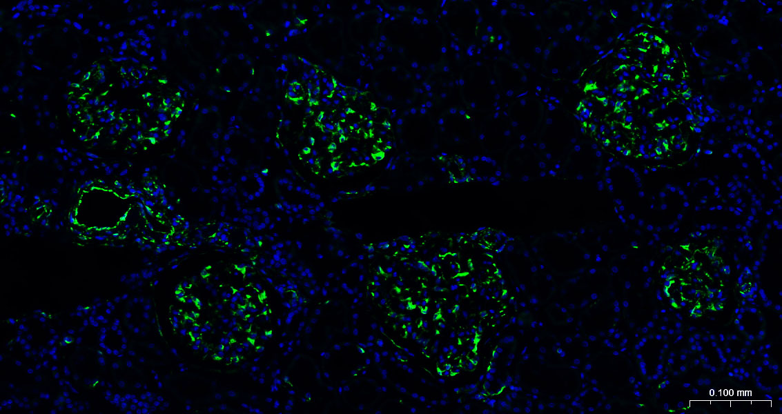 Paraformaldehyde-fixed, paraffin embedded Human Kidney; Antigen retrieval by boiling in sodium citrate buffer (pH6.0) for 15 min; Antibody incubation with Vimentin Polyclonal Antibody, Unconjugated (bs-8533R) at 1:200 overnight at 4°C. Followed by conjugated Goat Anti-Rabbit IgG antibody (green, bs-60295G-BF488), DAPI (blue, C02-04002) was used to stain the cell nuclei.