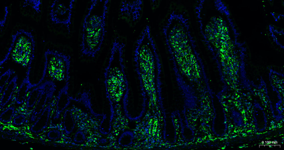 Paraformaldehyde-fixed, paraffin embedded Human Small Intestine; Antigen retrieval by boiling in sodium citrate buffer (pH6.0) for 15 min; Antibody incubation with Vimentin Polyclonal Antibody, Unconjugated (bs-8533R) at 1:200 overnight at 4°C. Followed by conjugated Goat Anti-Rabbit IgG antibody (green, bs-60295G-BF488), DAPI (blue, C02-04002) was used to stain the cell nuclei.