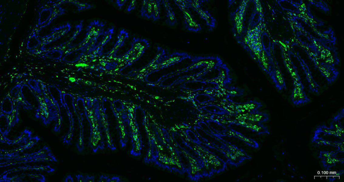 Paraformaldehyde-fixed, paraffin embedded Mouse Colon; Antigen retrieval by boiling in sodium citrate buffer (pH6.0) for 15 min; Antibody incubation with Vimentin Polyclonal Antibody, Unconjugated (bs-8533R) at 1:200 overnight at 4°C. Followed by conjugated Goat Anti-Rabbit IgG antibody (green, bs-60295G-BF488), DAPI (blue, C02-04002) was used to stain the cell nuclei.