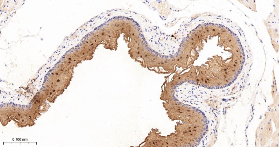 Paraformaldehyde-fixed, paraffin embedded Rat Esophagus; Antigen retrieval by boiling in sodium citrate buffer (pH6.0) for 15 min; The section was incubated with 14-3-3 sigma Monoclonal Antibody, Unconjugated (bsm-52005R) at 1:200 overnight at 4°C, followed by conjugation to the bs-0295G-HRP and DAB (C-0010) staining.